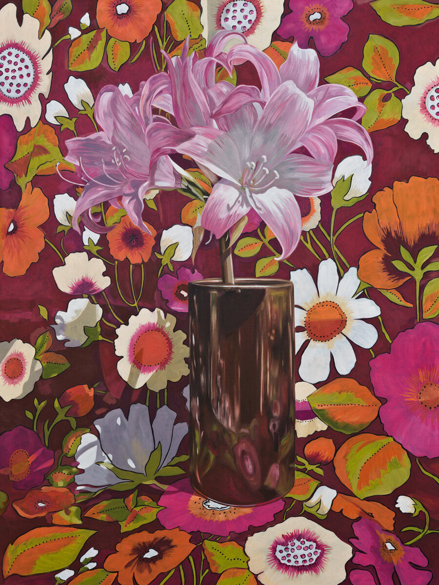 From the Retrograde collection. 60s and 70s Fabric design flattened and simplified natural forms. This image depicts the process- the lillies are camouflaged, both part of, and distinct from, the background.