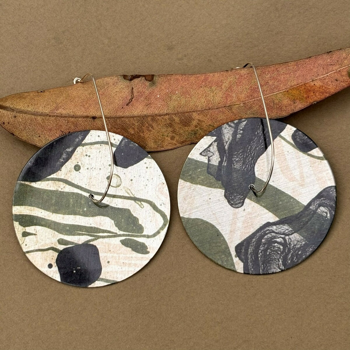 Large and amazing. These bold statement earrings feature the high contrast Submerge lithographic image on stunning brushed silver aluminium. The pendant is suspended from the centre hole by gorgeous sterling silver tear drop hooks.