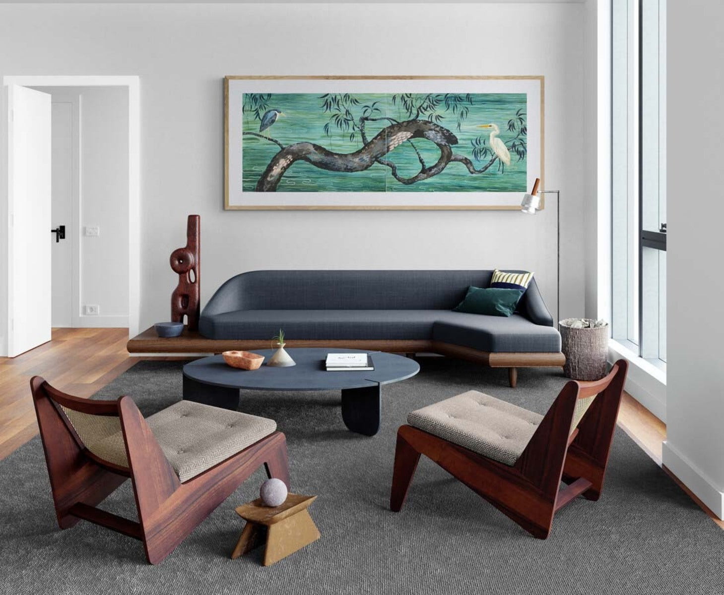 This artwork is currently framed in Perspex - floated on top of an off-white mat, in a natural timber frame.