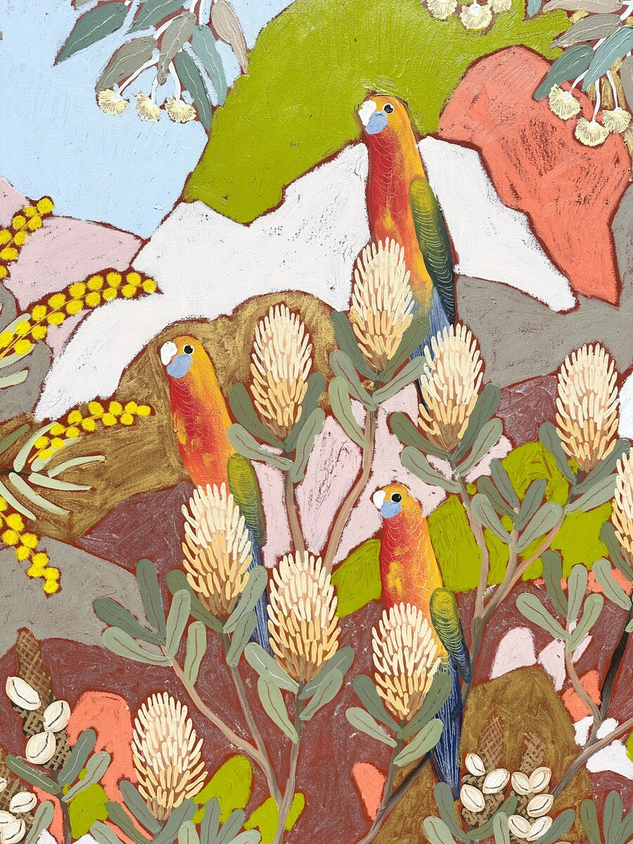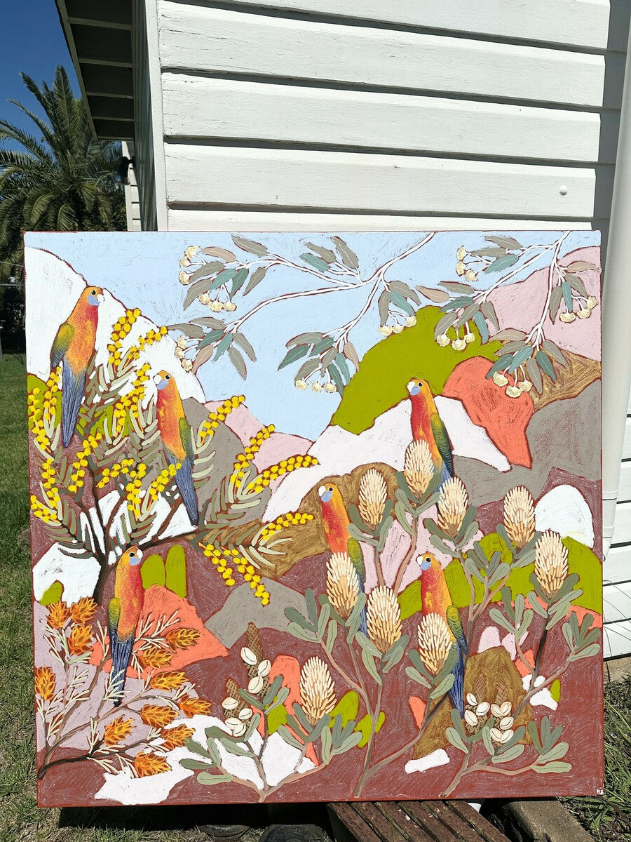 Adelaide Rosellas watching each other forage amongst Australian flora. Rocky Terrain displays the harsh Australian landscape.