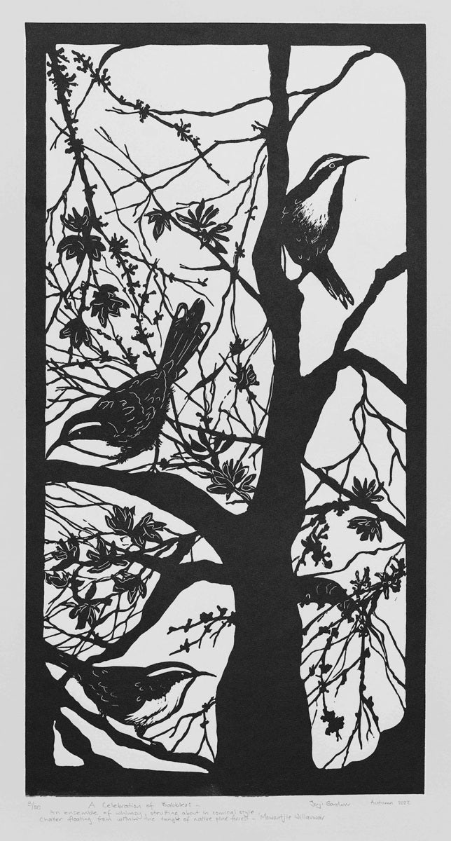 This work celebrates the important connection between habitat and species conservation. The native Callitris Pine was once common throughout Adelaide, providing essential foraging and shelter for many birds including the White-browed Babbler.