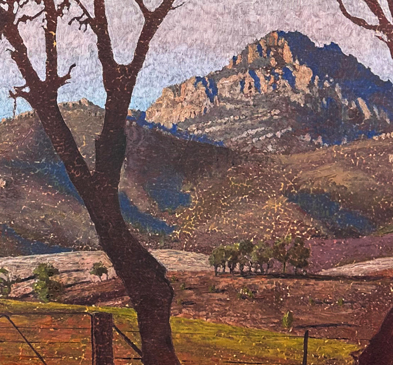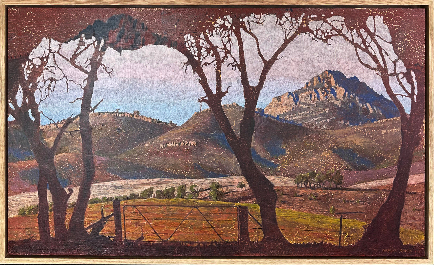 This is a view framed by a cops of mallee trees off Glass Gorge Road, looking over Oratunga Station, to Mt Patawarta, a mountain that often featured in Hans Heysens work, including one called The land of the Oratunga in AGSA. The artist has spent 10 years working at Oratunga Station in a group of other artists, painting en plein air and absorbing the landscape to sustain studio work back in Adelaide.