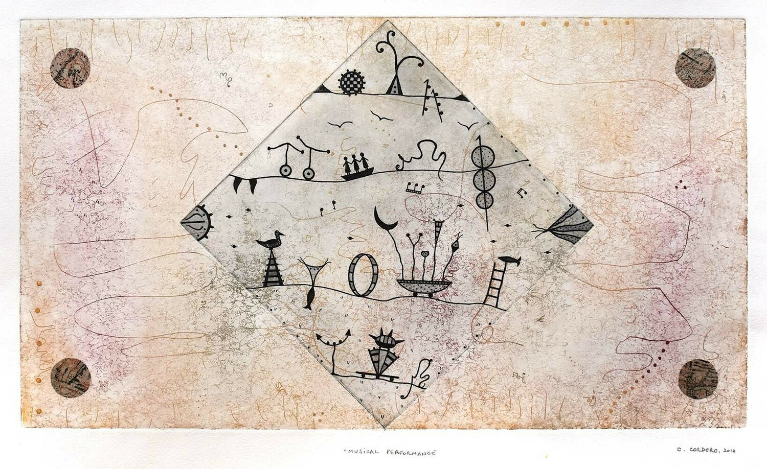 This hand printed etching print was made by Sydney based Chilean born artist Christina Cordero. Cordero uses multiple plates and printmaking techniques, and often incorporates hand drawn and painted elements.