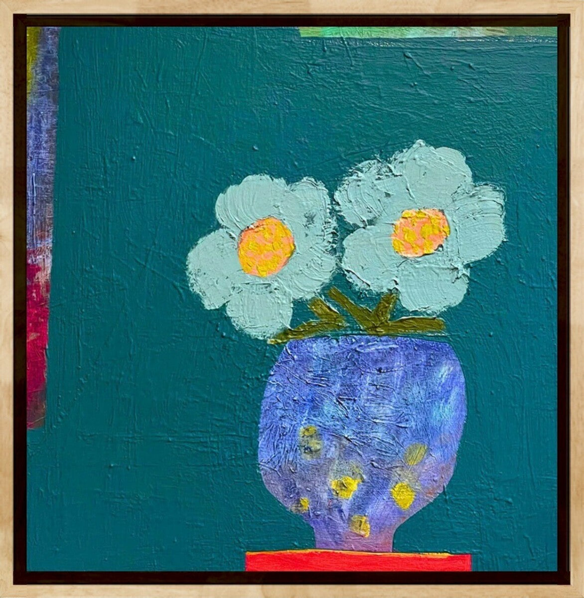 A contemporary painting by Holly Eva, featuring two flowers emerging from an imperfect, textured purple vase with gold spots. Rather than painting the image itself, Holly captures the emotion flowers evoke—how they stand as symbols of lovers, she paints connection, and the quiet intimacy. With bold textures and a minimalist style, this modern piece speaks of presence, pride, and the tender power of feeling.