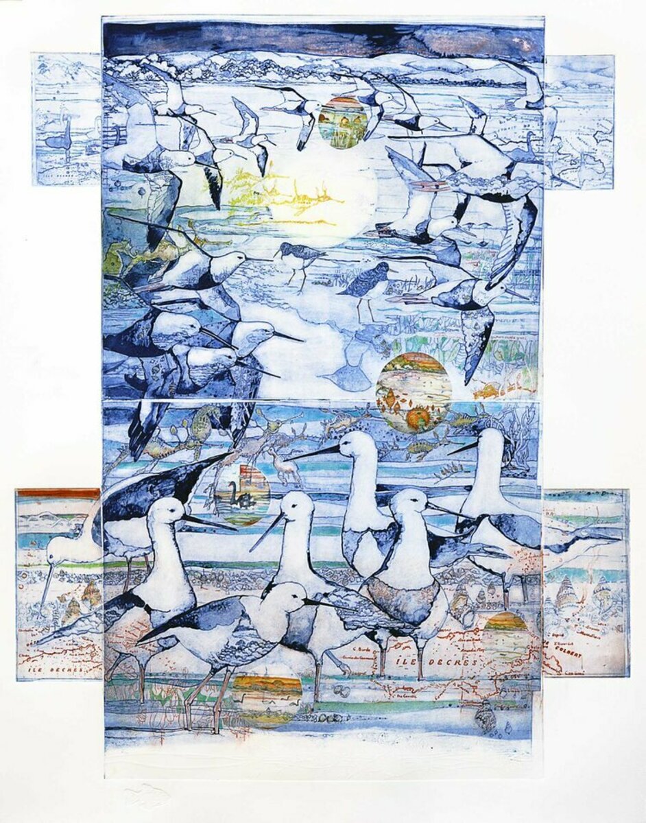Multiple plate etching, hand colouring and embossing on Hahnemuhle rag paper. Edition of 100