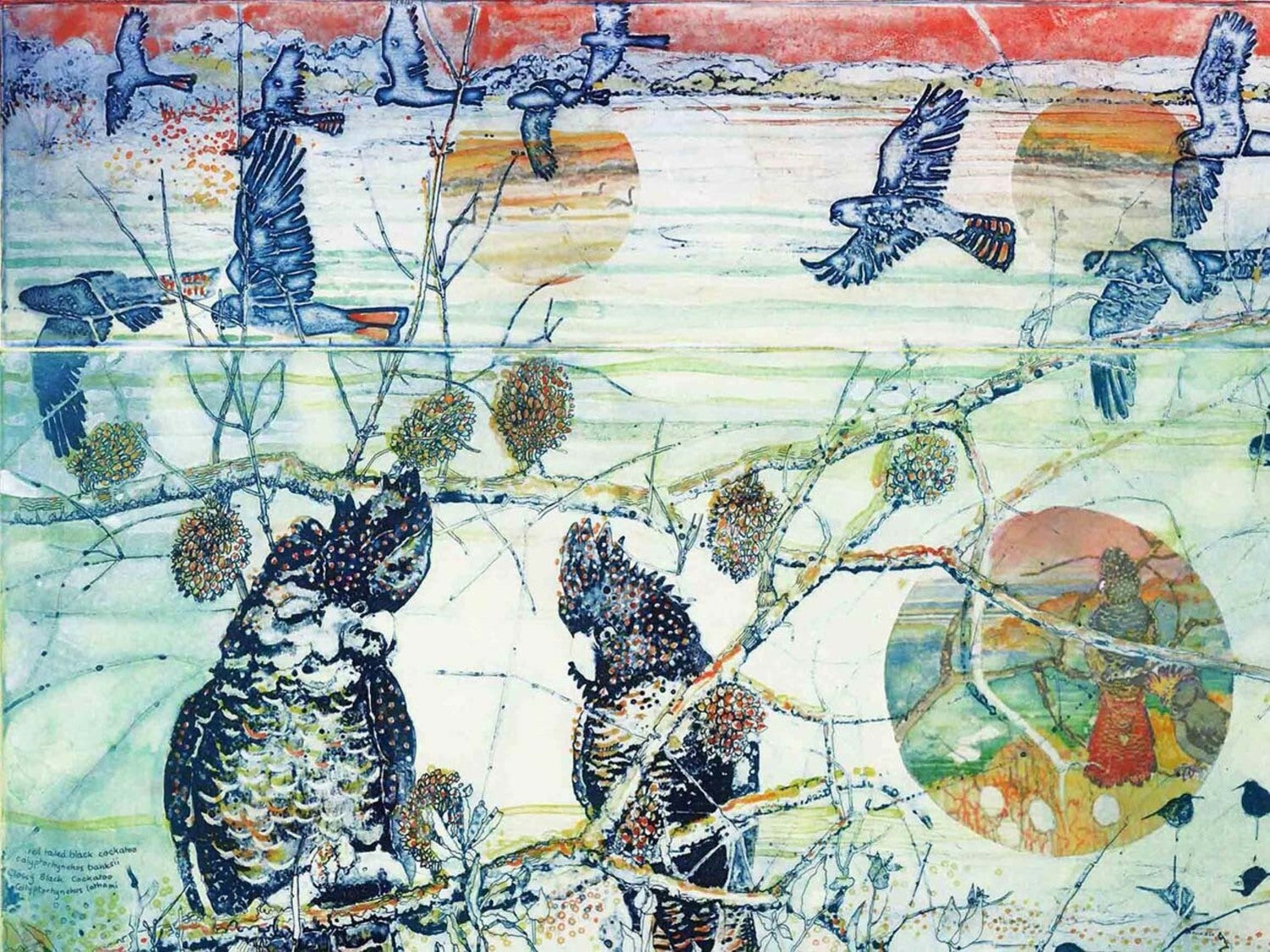 Janet’s etchings incorporate multiple printmaking process including multiple plates with different colours, as well as chine collé, archival digital print and hand-painted elements. Her work is inspired from her inner world, her family and the landscape of the Adelaide Hills and her childhood home on Kangaroo Island.