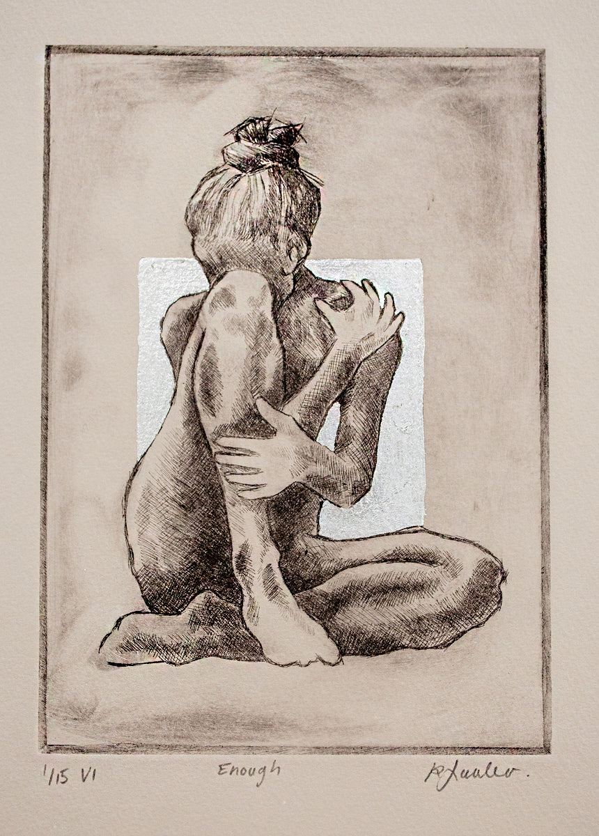 'Enough' presents a figure seated in a folded posture, their arms wrapped tightly around one raised leg. The figure’s body language speaks of self-embrace and protection, the hands clinging to the self as if seeking comfort and reassurance. The detailed linework captures the tension in the form, suggesting a moment of introspection and personal resolve.