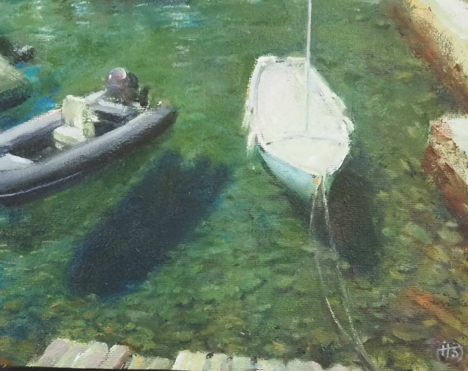 This artwork continues Harry's fascination with the elusive medium of water. This picture is an intimate view that celebrates the transparent beauty and clarity of the Mediterranean Sea, with deep blue shadows acting to float the boats above.