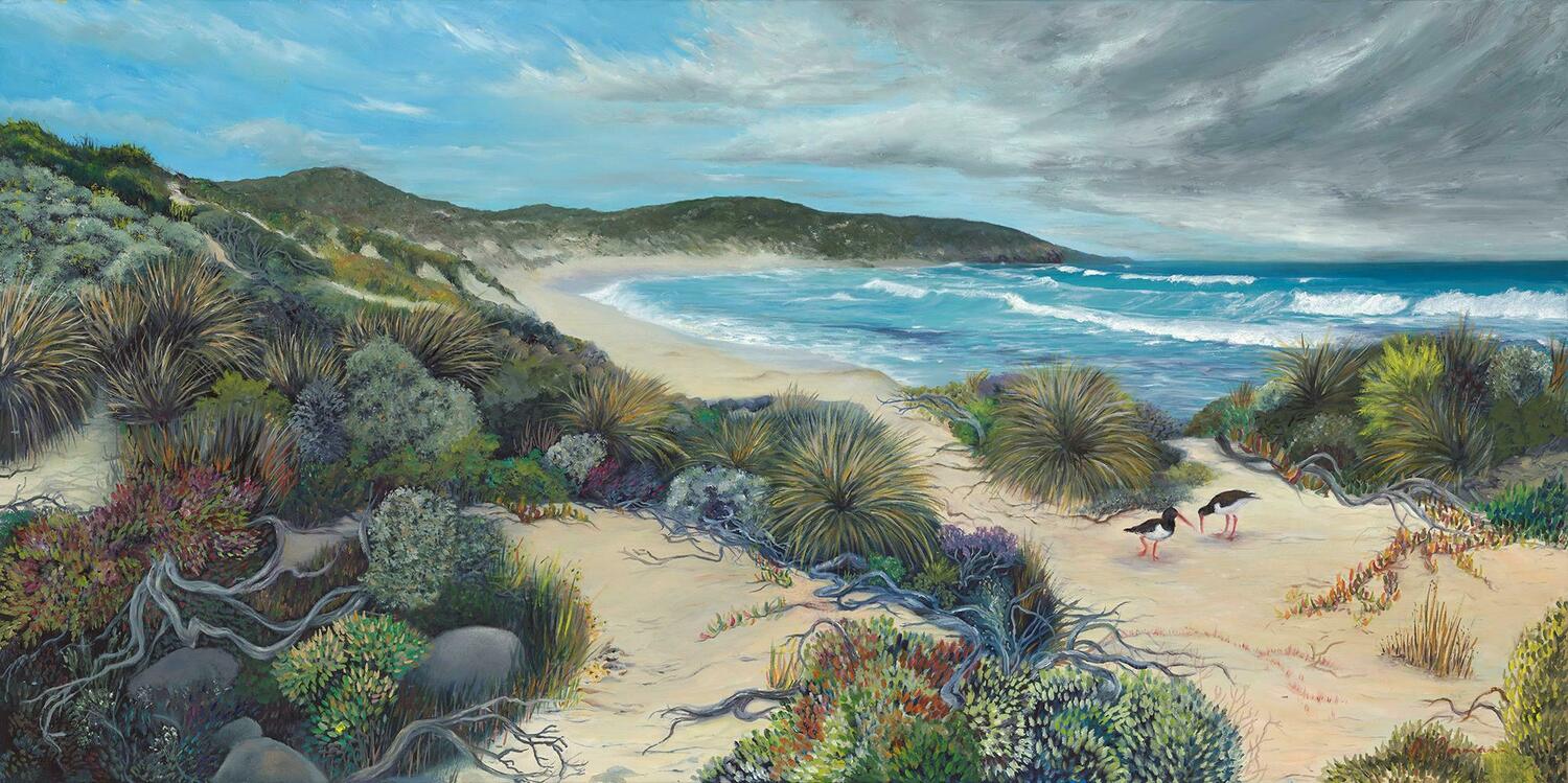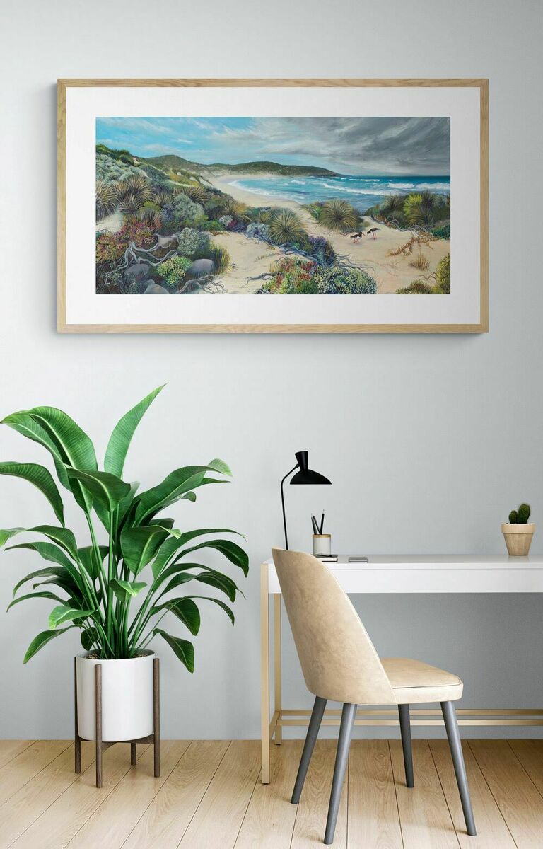 Pied Oystercatchers at Hanson Bay is a limited edition archival print of an original painting by South Australian artist Mishka Ammann.