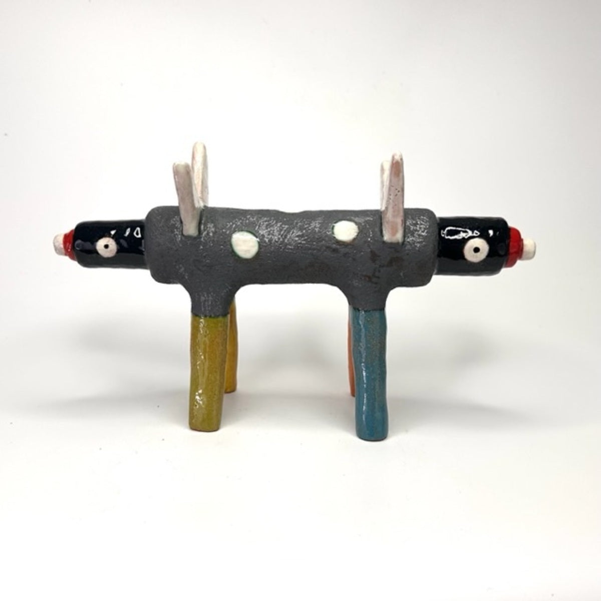 A torpedo dingo with two heads. Copper oxide body, various glazes, raku clay.