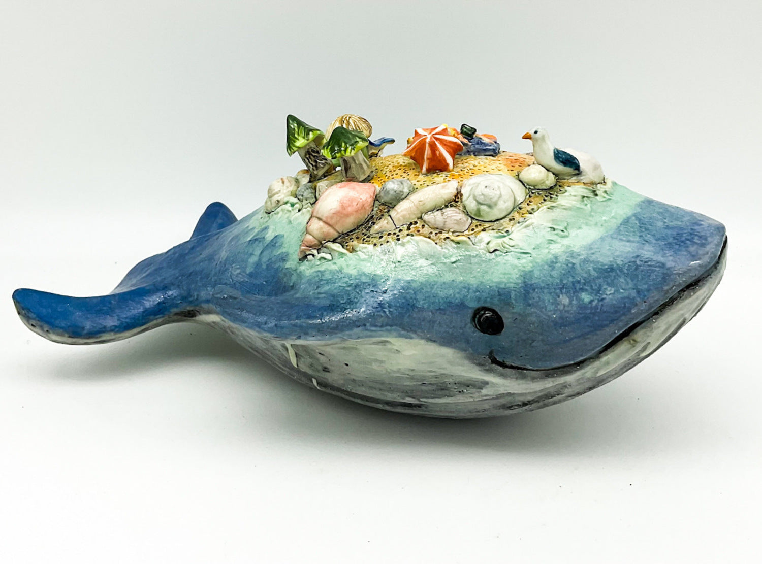 Hand sculpted whale with detailed miniature beach scape island on top
