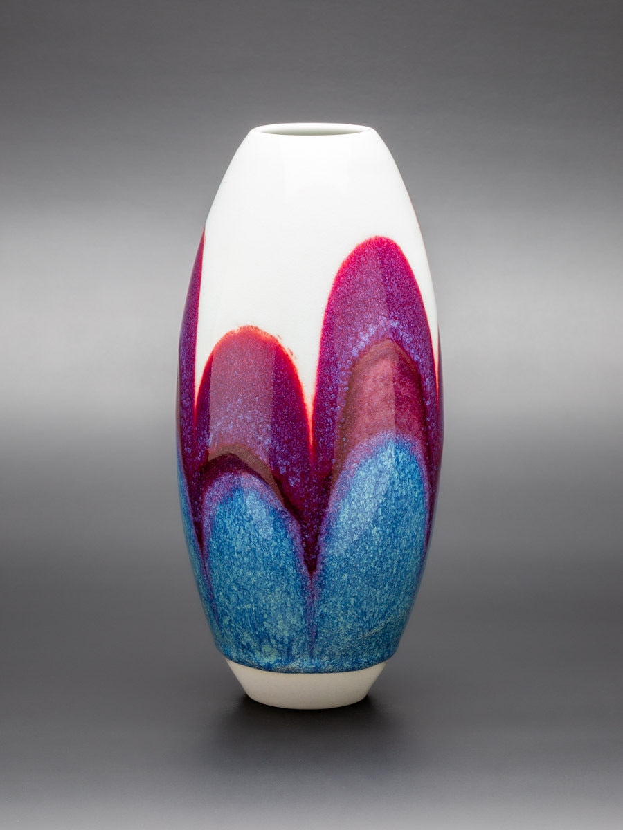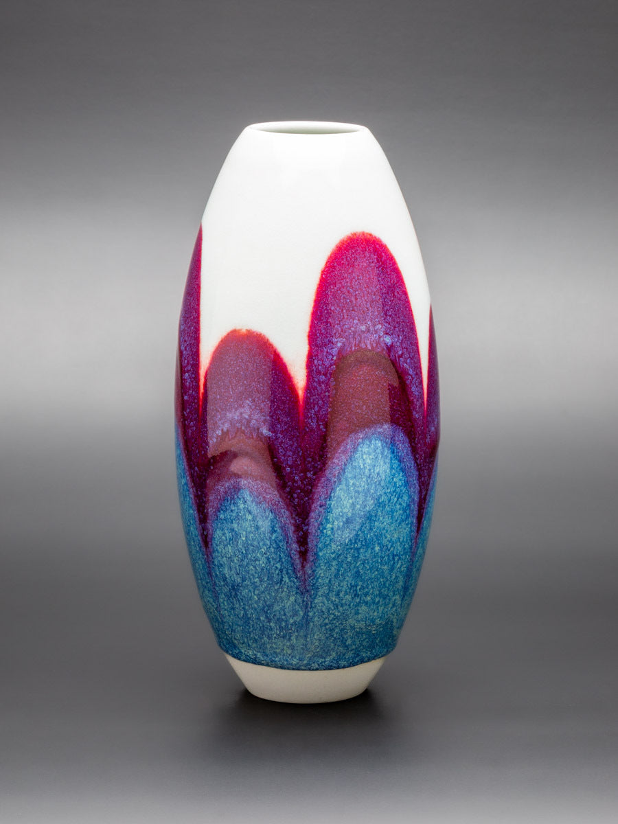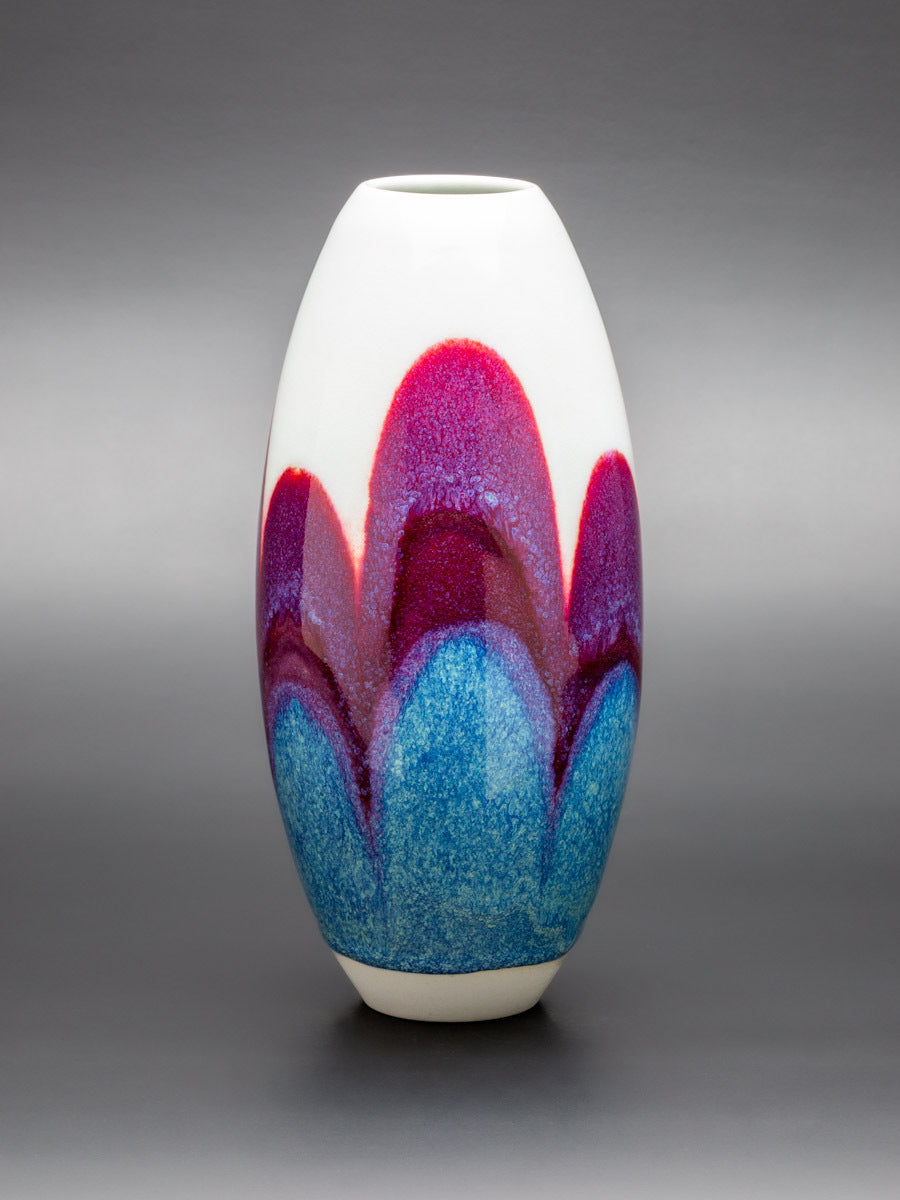 Wheel thrown Keane Lumina porcelain, layered glaze applications, gas reduction fired to 1315