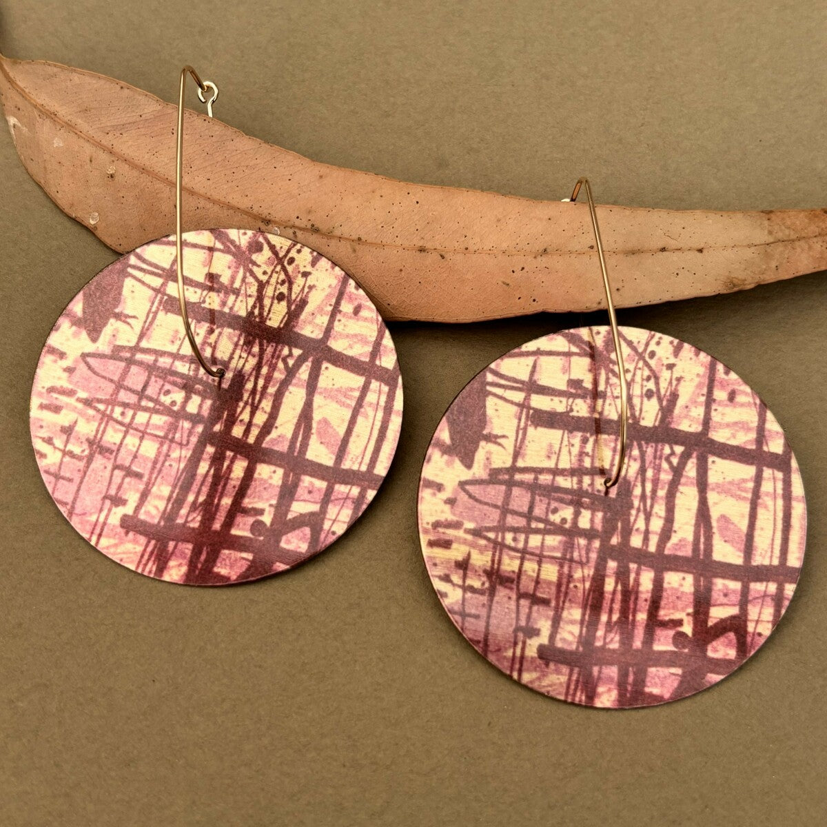 These statement earrings feature intricate crimson graphic linework on stunning gold brushed aluminium. The pendant is suspended from the centre hole by gorgeous 14k gold filled tear drop hooks.
