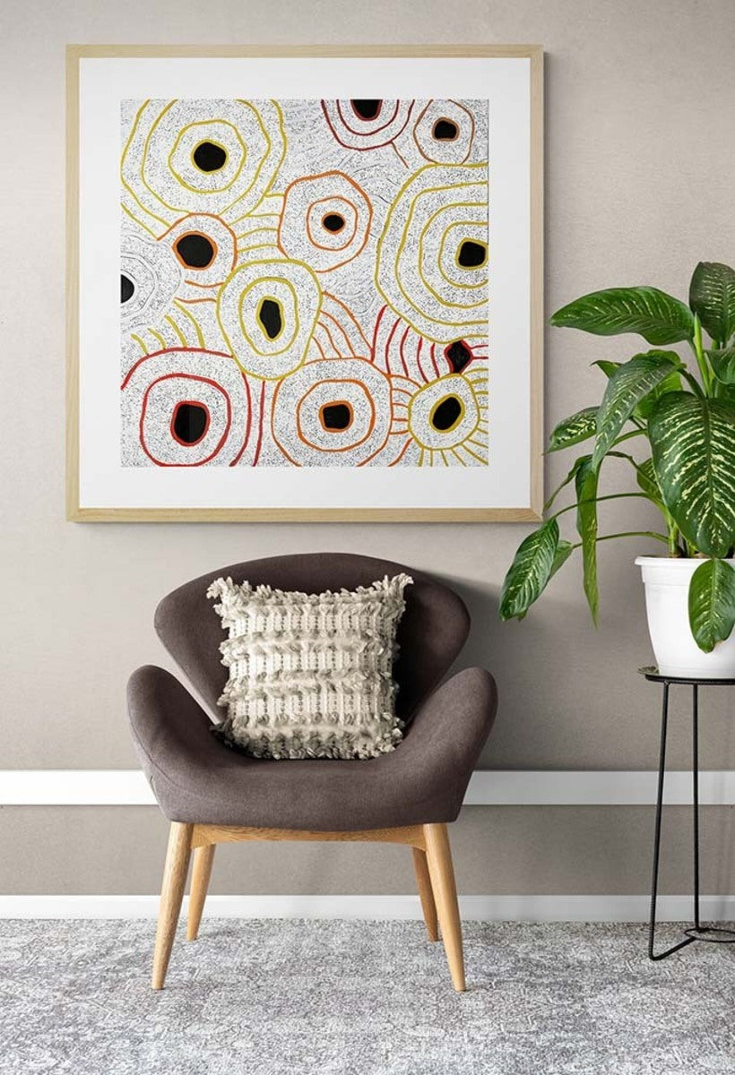 This artwork is a limited edition archival print of an original painting by South Australian / Pintupi artist Debra Nangala McDonald.