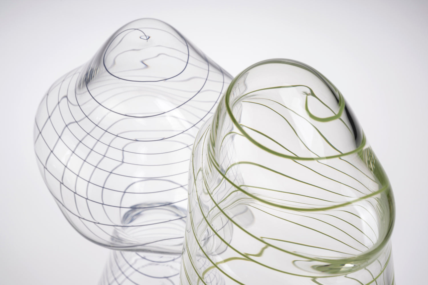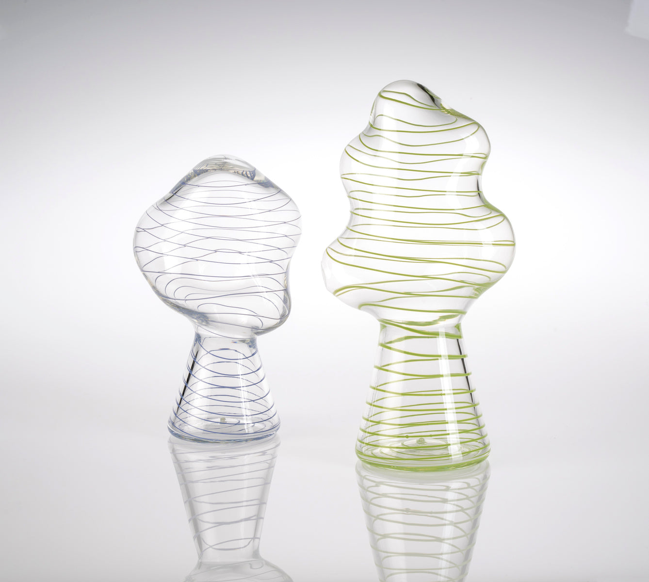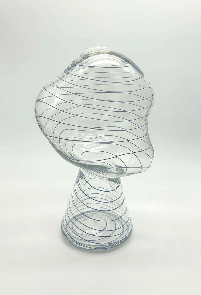 Enclosed blown glass sculpture in the abstract form of a tree with purple lines