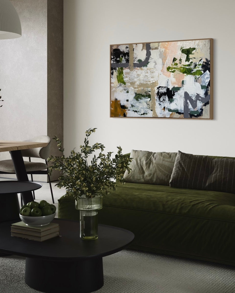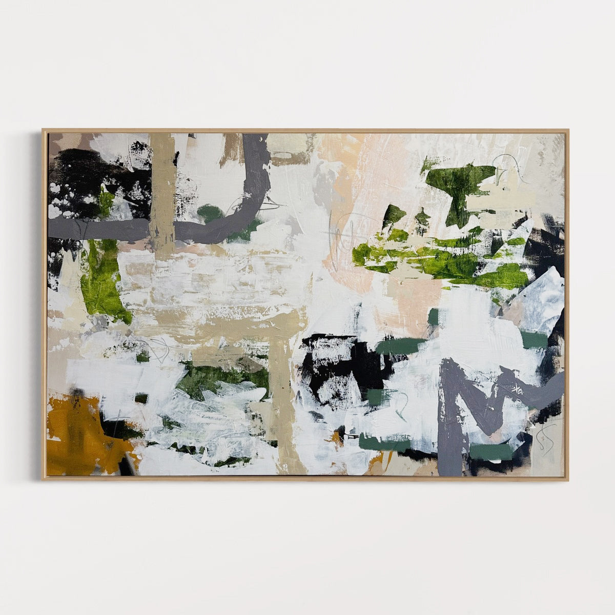 Quiet moments by Stefana Kachirski- a modern statement piece that will bring a sense of calm and inspiration to a space. The neutral and green colour palette combined with unique abstract lines come together to create a vibrant artwork. This artwork is an original painting on quality canvas- stretched and ready to hang.