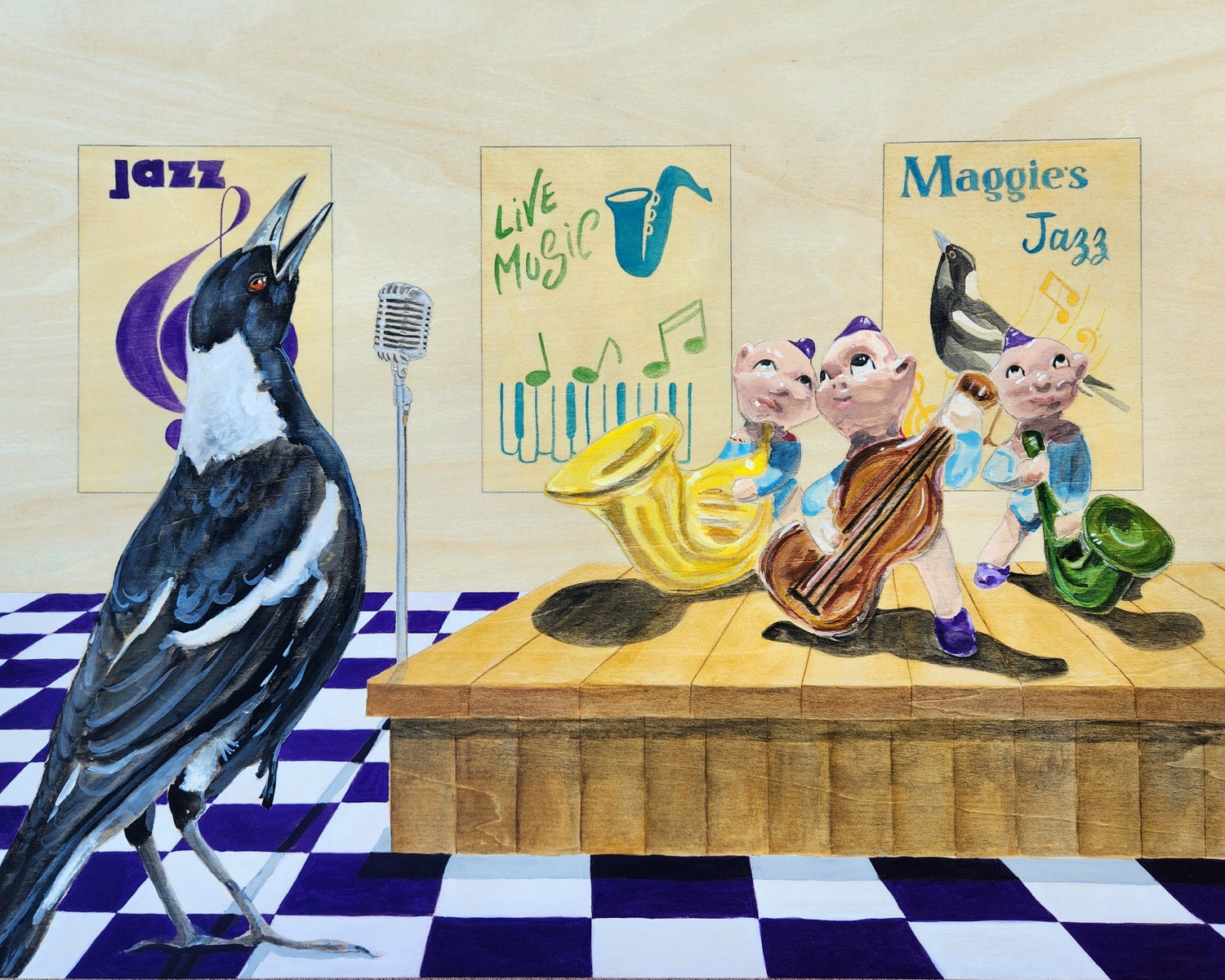 The Swooping Notes features a musical group of vintage ornaments displayed in a disproportionate world to suit their size. Welcome to Maggie's Jazz Club. Maggie's warbling notes fill the air along with the lively music coming from the trio on stage.