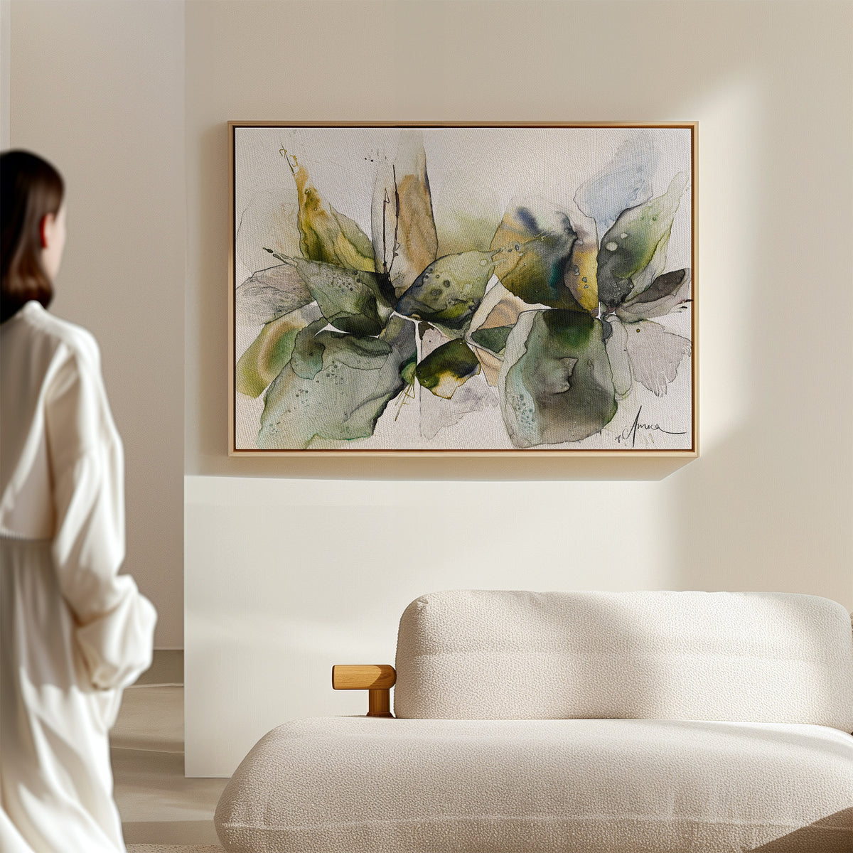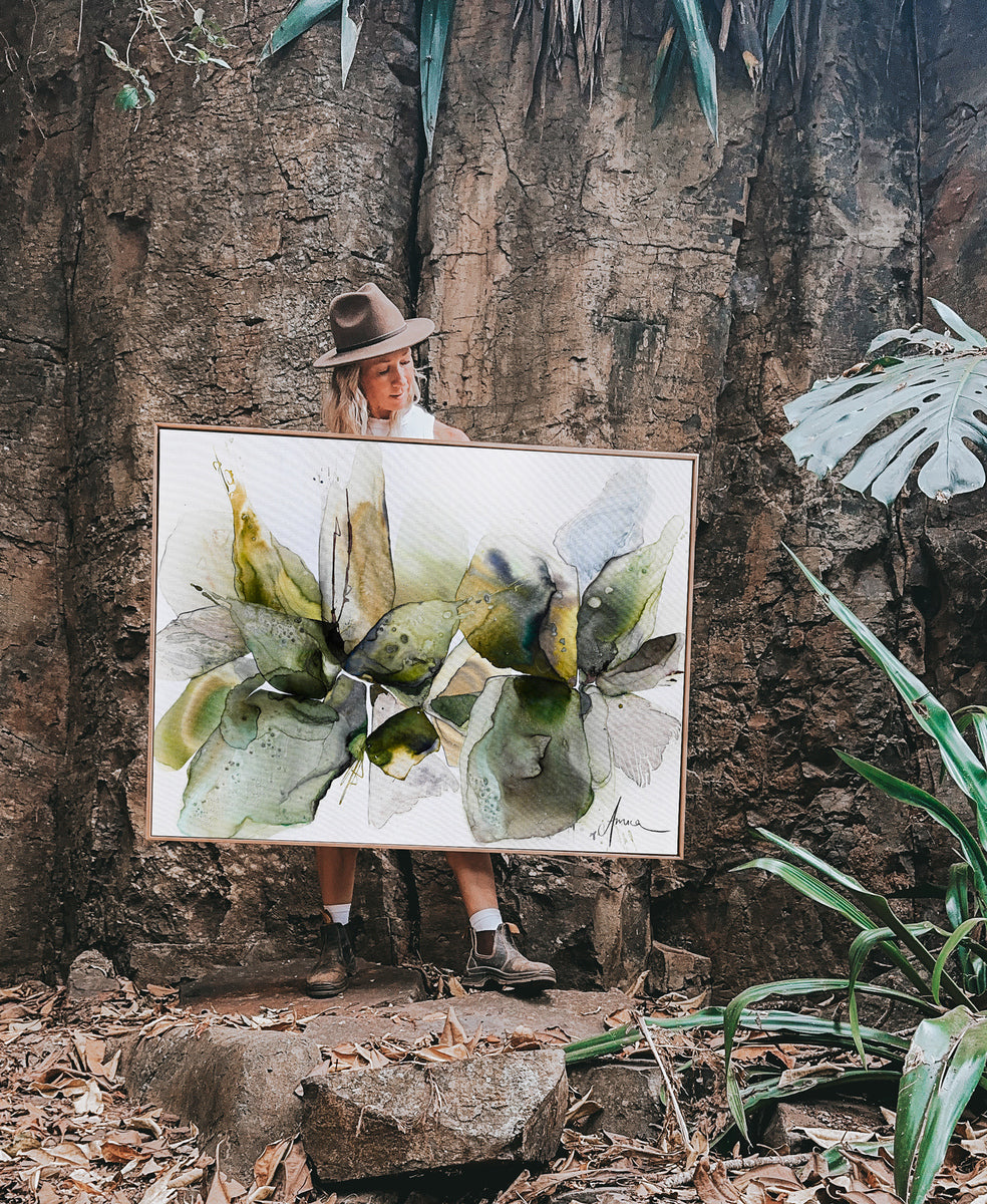 In my studio, I let paint pool and flow with the same unhurried intention of those rainforest leaves. Layer upon layer of earthy greens and forest shadows, allowing chaos to settle where it wanted. Then came my favorite part—the white space. The Ma. That beautiful negative space giving everything room to breathe.